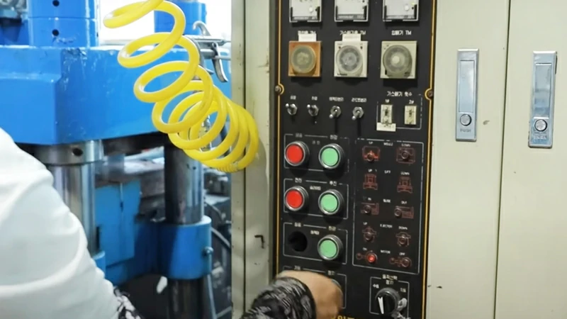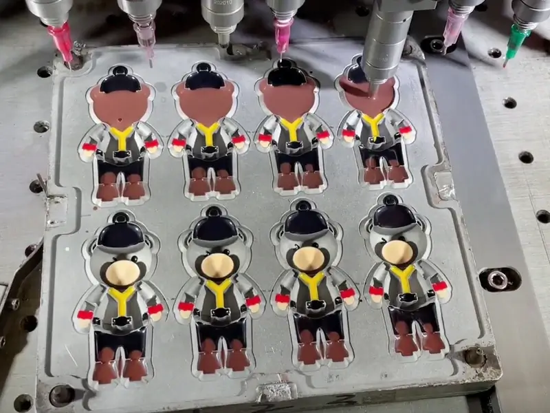 The machine carefully dispenses liquid silicone onto the mold according to the settings, thereby creating the desired shapes.